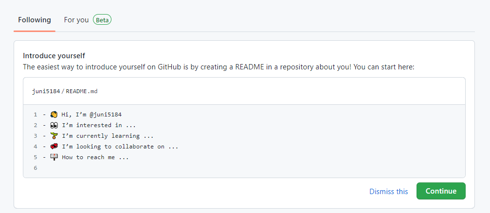 Dismiss 할 수도 있지만 Continue 해서 github 프로필을 꾸며보자