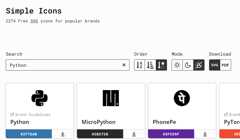 2, 3번은 https://simpleicons.org/ 라는 홈페이지에서 "Python"을 검색해서 추천 색상, 아이콘 이름을 넣어준다.