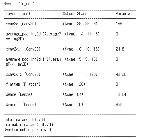 model=LeNet(10) # 여기서 10이 의미하는 바는 num_classes