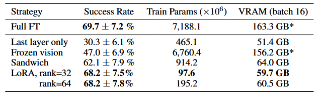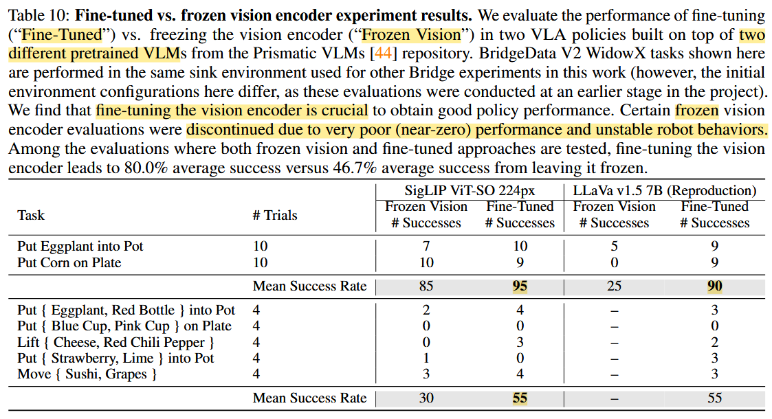 - Fine-Tuning Vision Encoder: we found fine-tuning the vision encoder during VLA training to be crucial for good VLA performance.