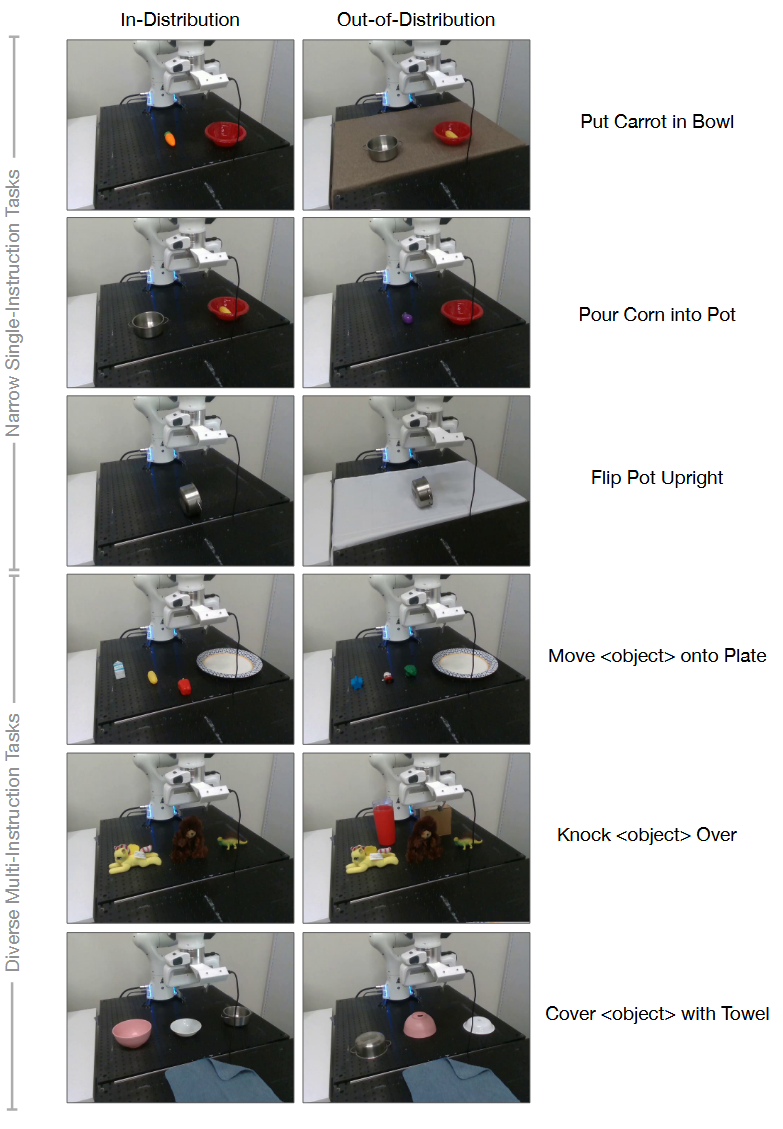 모델의 모든 파라미터를 완전히 파인튜닝하며, collect 10–150 demonstrations of each of 7 tasks. Each method with 10–12 in-distribution trials and 5–6 OOD generalization trials.