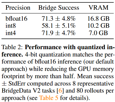 - 표 2에서는 8-bit 양자화가 낮은 추론 속도로 인해 가장 낮은 롤아웃 성능을 보였지만,
