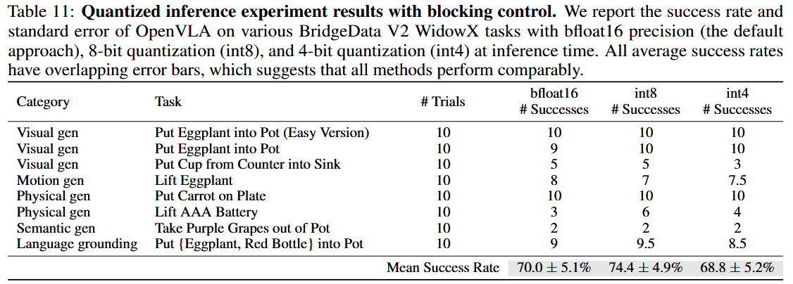 (3) we are the first to demonstrate the effectiveness of ****modern PEFT and quantization approaches for VLAs;